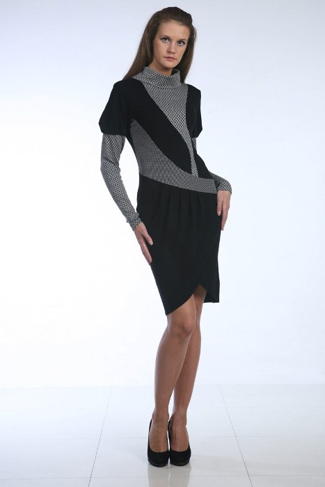 Комбинированное платье из трикотажного джерси прилегающего силуэта, с рукавом-фонарик. Низ изделия имитирует юбку с запахом , задрапированную вертикальными складками.Рукав резной,по окату заложены крупные складки,низ изделия тоже задрапирован.Втачная молния сзади.